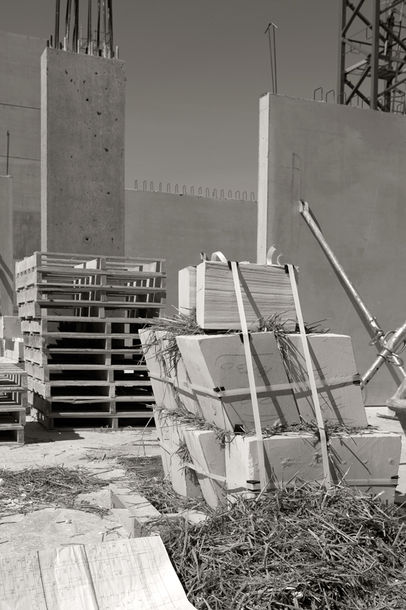 Ainsi, les grandes poutres en béton blanc massif de teinte pierre qui rappellent de grands linteaux des constructions antiques, les murs, les cages d'ascenseurs, les escaliers, les dalles, arrivent-ils aussi tous directement par semi-remorques sur le chantier et sont positionnés rapidement dans leur emplacement définitif . La cadence est telle que le chantier est presque méconnaissable d'une semaine sur l'autre.